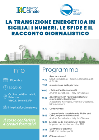 Italy for Climate organizza il primo appuntamento formativo territoriale dedicato ai giornalisti sulla transizione energetica. L’incontro “Transizione energetica in Sicilia: i numeri, le sfide e il racconto giornalistico” si terrà lunedì 1 dicembre 2025 a Palermo, in collaborazione con l’Ordine dei Giornalisti di Sicilia, e riconoscerà 4 crediti formativi professionali.